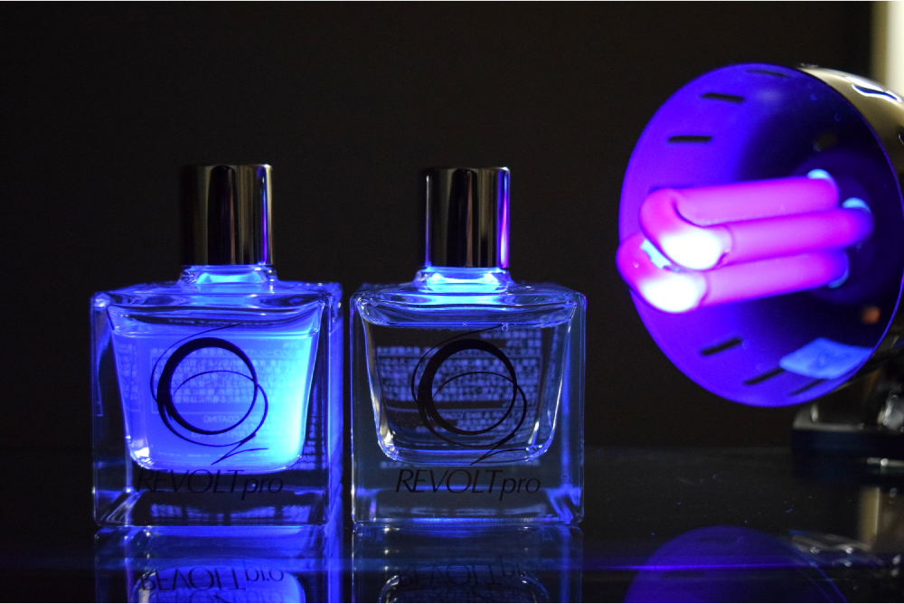 UVAへの軽減効果:波長320–400nmのUVA帯域の紫外線を可視光線青帯域である450〜495nmへと変換する紫外線蛍光剤を含有しています。下記画像は左が紫外線蛍光剤を含有している新ベースコートです。右が従来のベースコートです。紫外線ライトにてUVA波長の紫外線を照射しますと青帯域の可視光線へと変換され光ります。変換されることで、UVA紫外線が軽減されます。