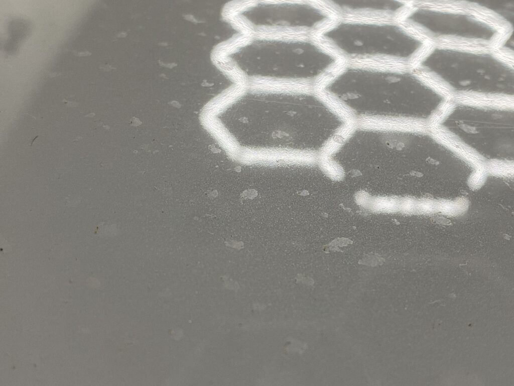 付着した花粉は、水分(雨・朝露)と気温の上昇により反応し、塗装表面に浸透・固着。