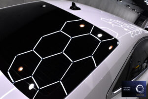 今回のお車は全体的に良好なコンディションが保たれていましたが、ライトの下で塗装面を確認すると、洗車などによる細かなキズやわずかなくすみが見受けられました。そこで塗装面の状態を整え、より美しい艶を引き出すための下地処理を行っていきます。