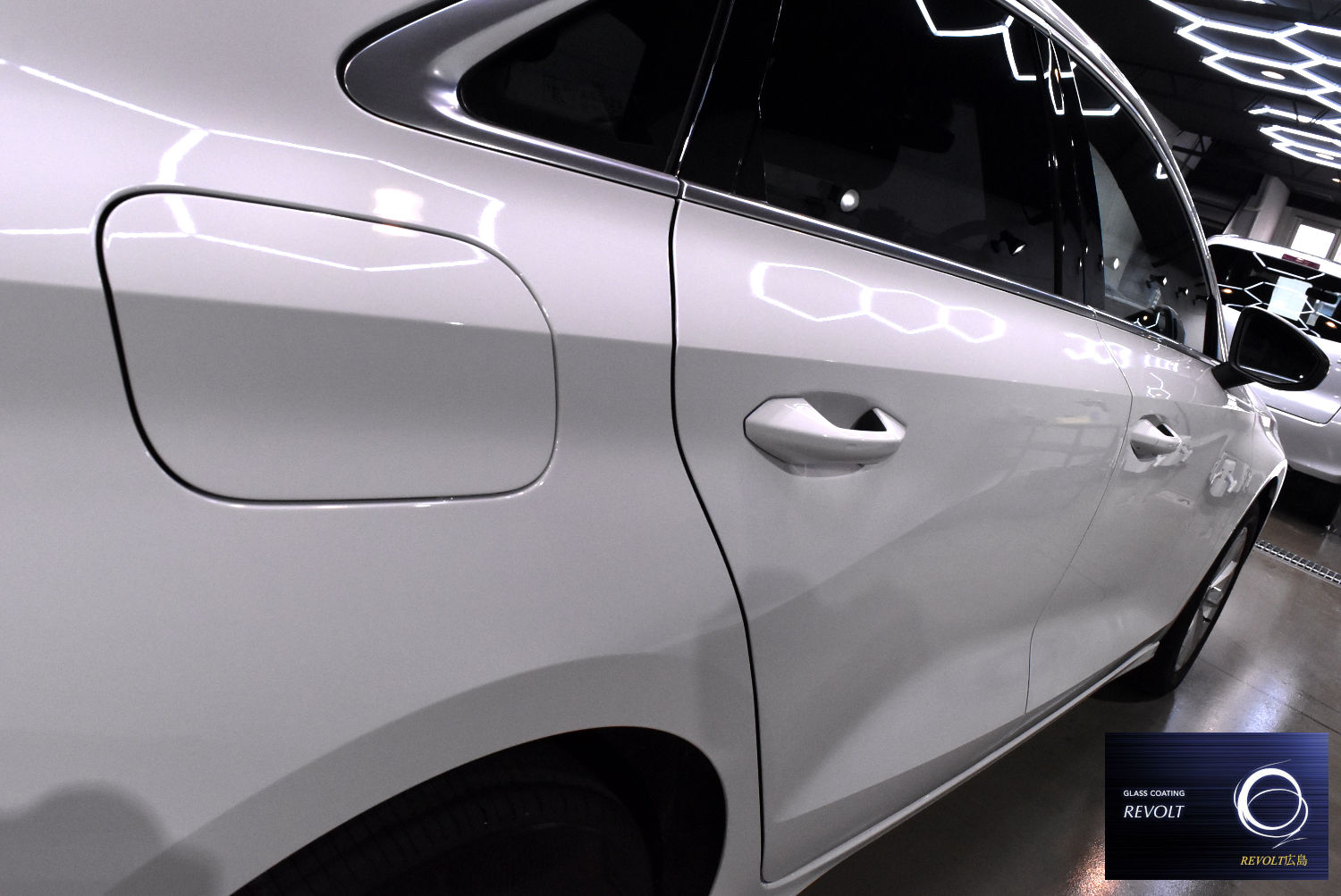 下地処理後はガラスコーティング 「リボルト」 を施工。高品質なガラス被膜がボディをしっかりと保護し、深みのある艶と滑らかな質感を実現します。