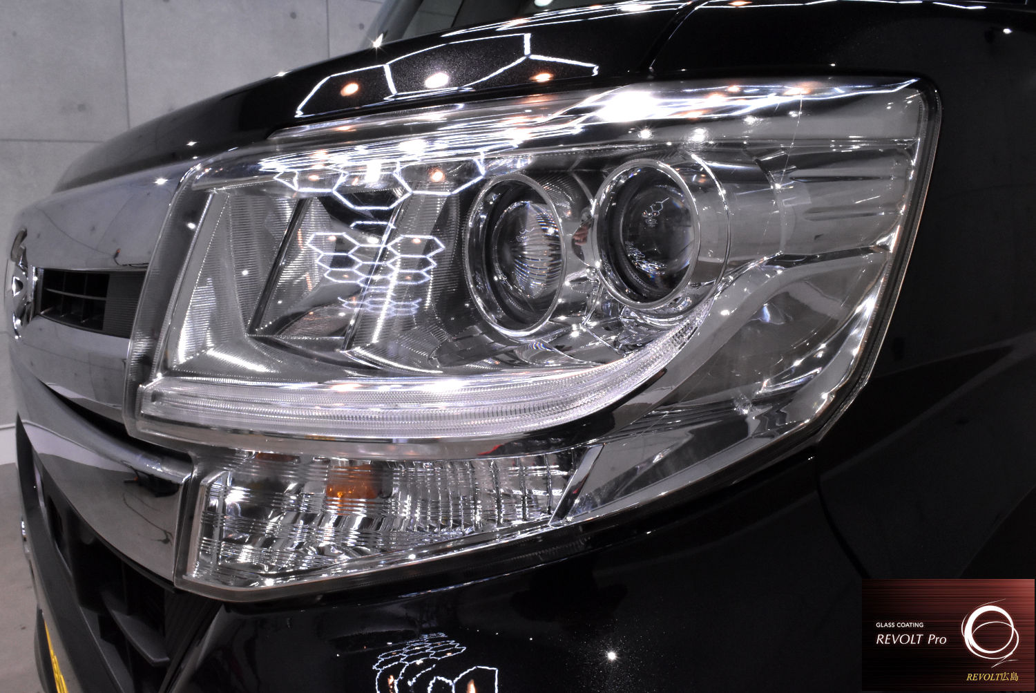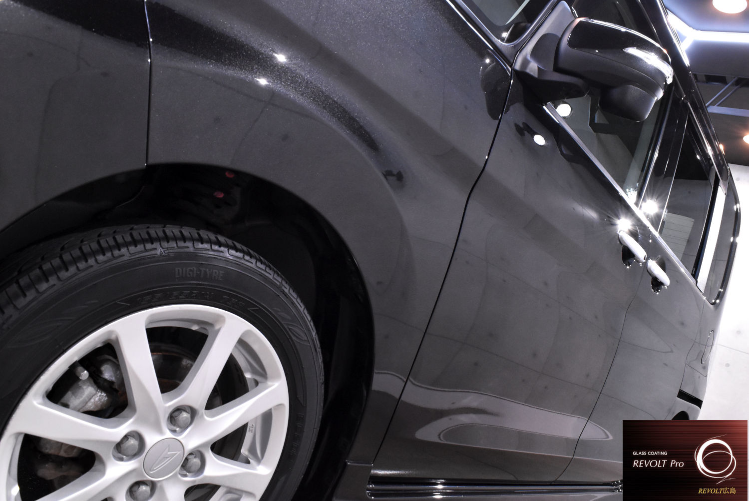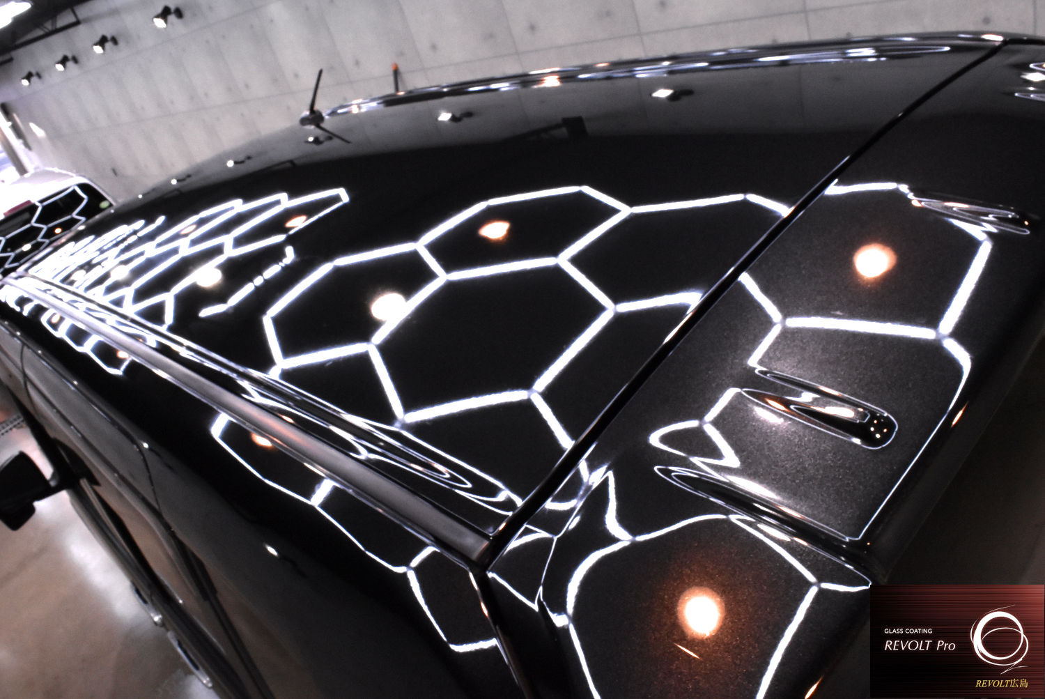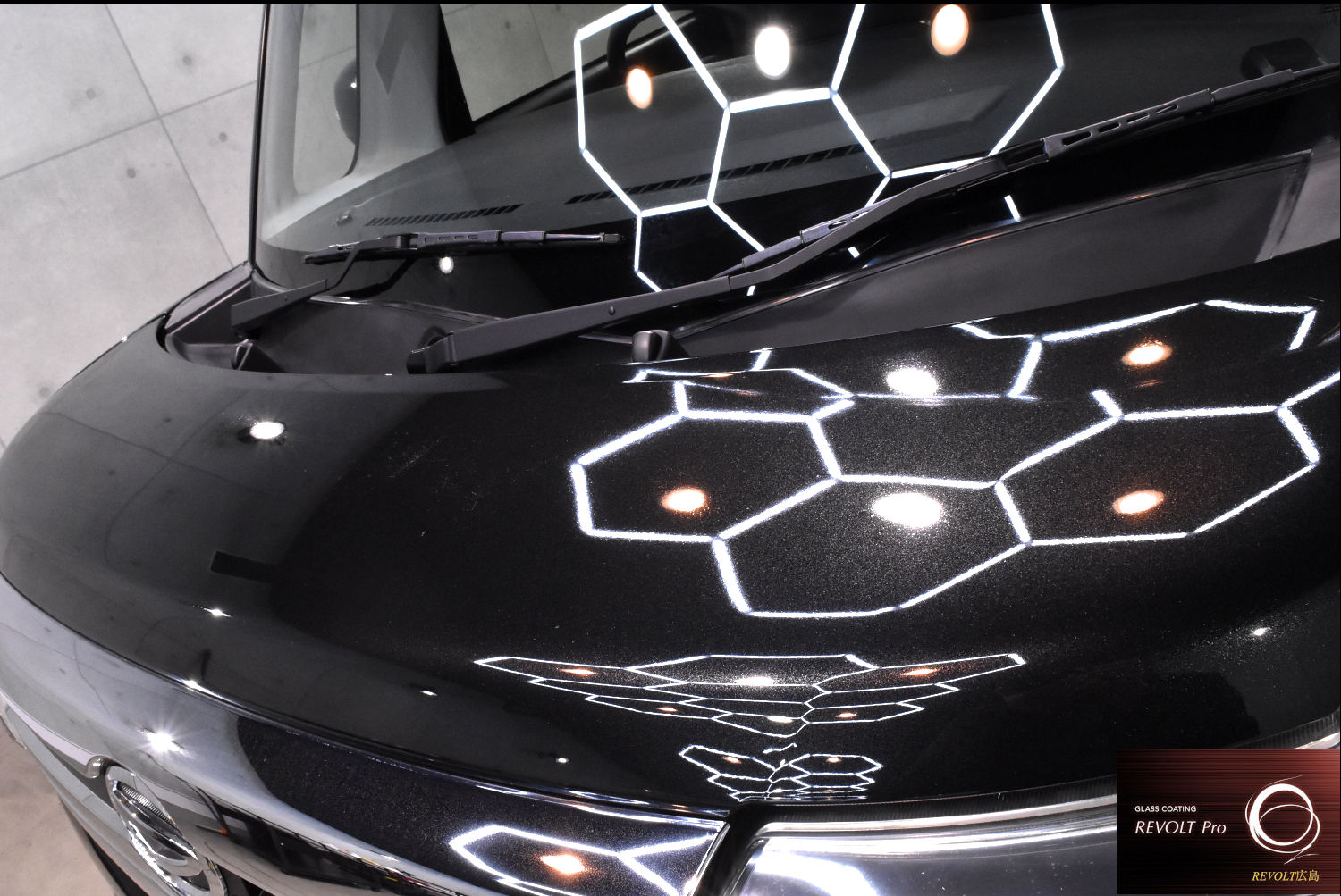 下地処理後は、高耐久ガラスコーティング 「リボルト・プロ」 を施工。高密度のガラス被膜がボディをしっかりと保護し、深みのある艶と滑らかな質感を実現します。